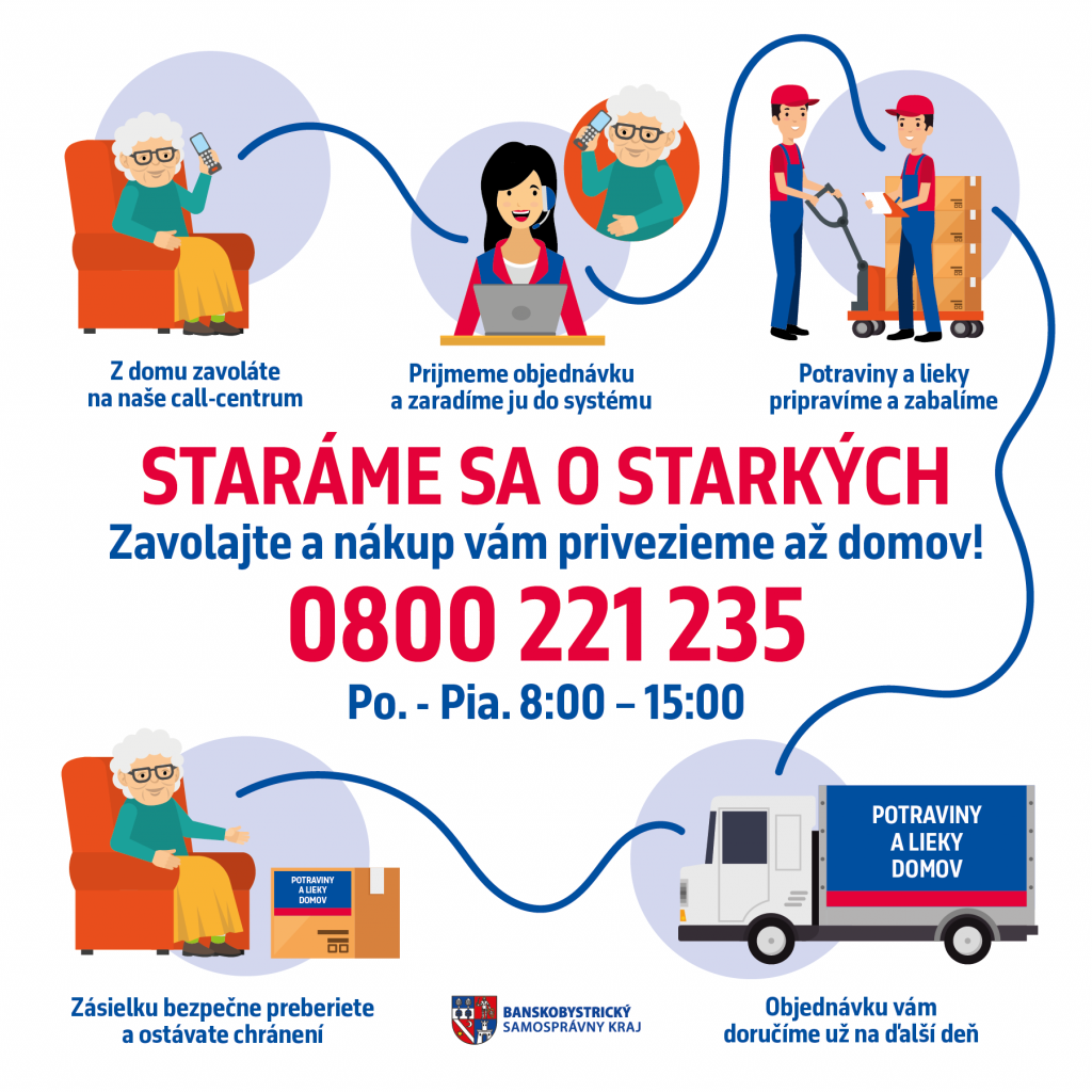 Vážení občania,Banskobystrický samosprávny kraj spustil donášku potravín pre seniorov, zatiaľ pre okresy Brezno a Banská Bystrica Seniori a ľudia z rizikových skupín môžu už dnes telefonovať na bezplatné telefóne číslo 0800 221 235 a objednať si domov donášku potravín. Tú zabezpečí BBSK s dobrovoľníkmi na druhý pracovný deň.